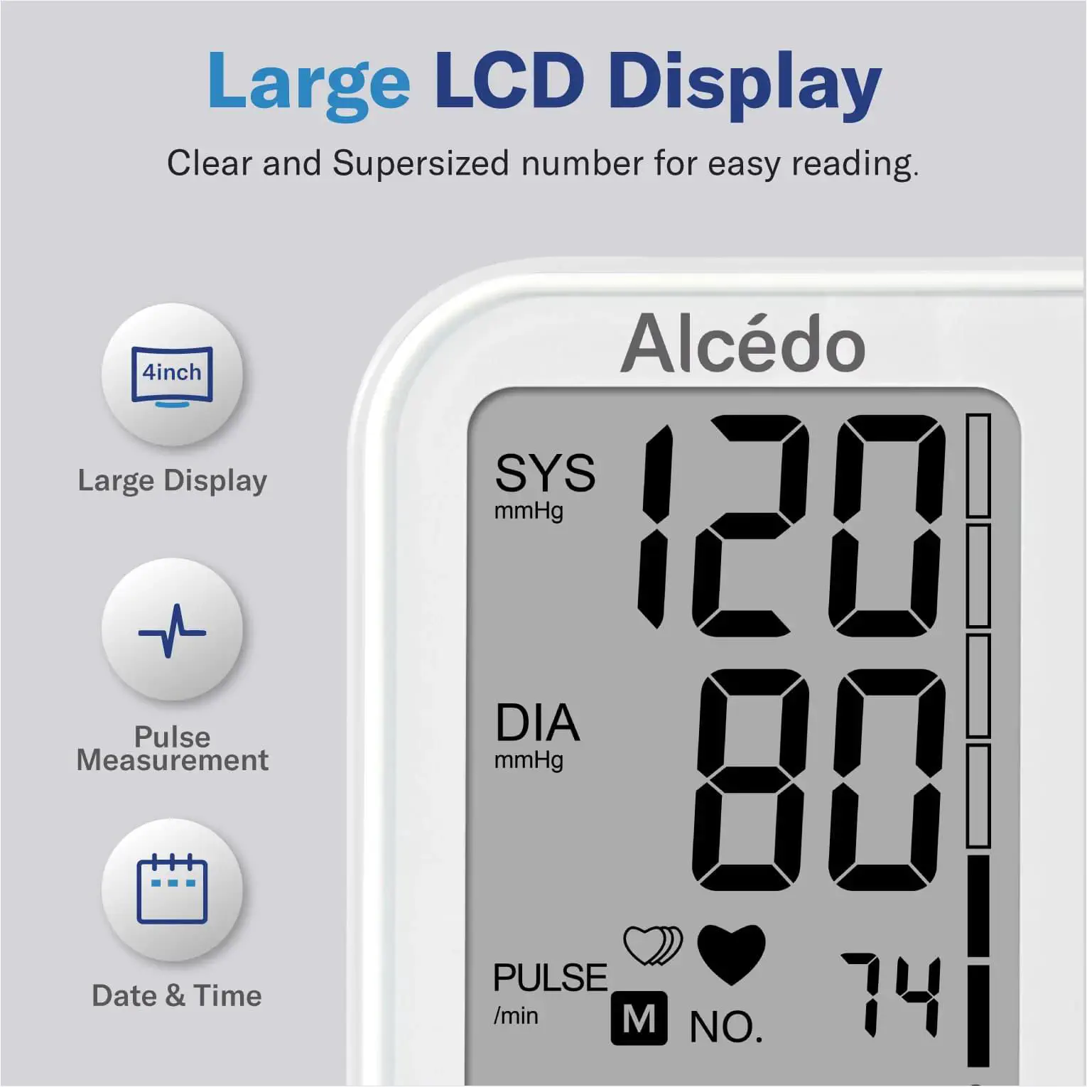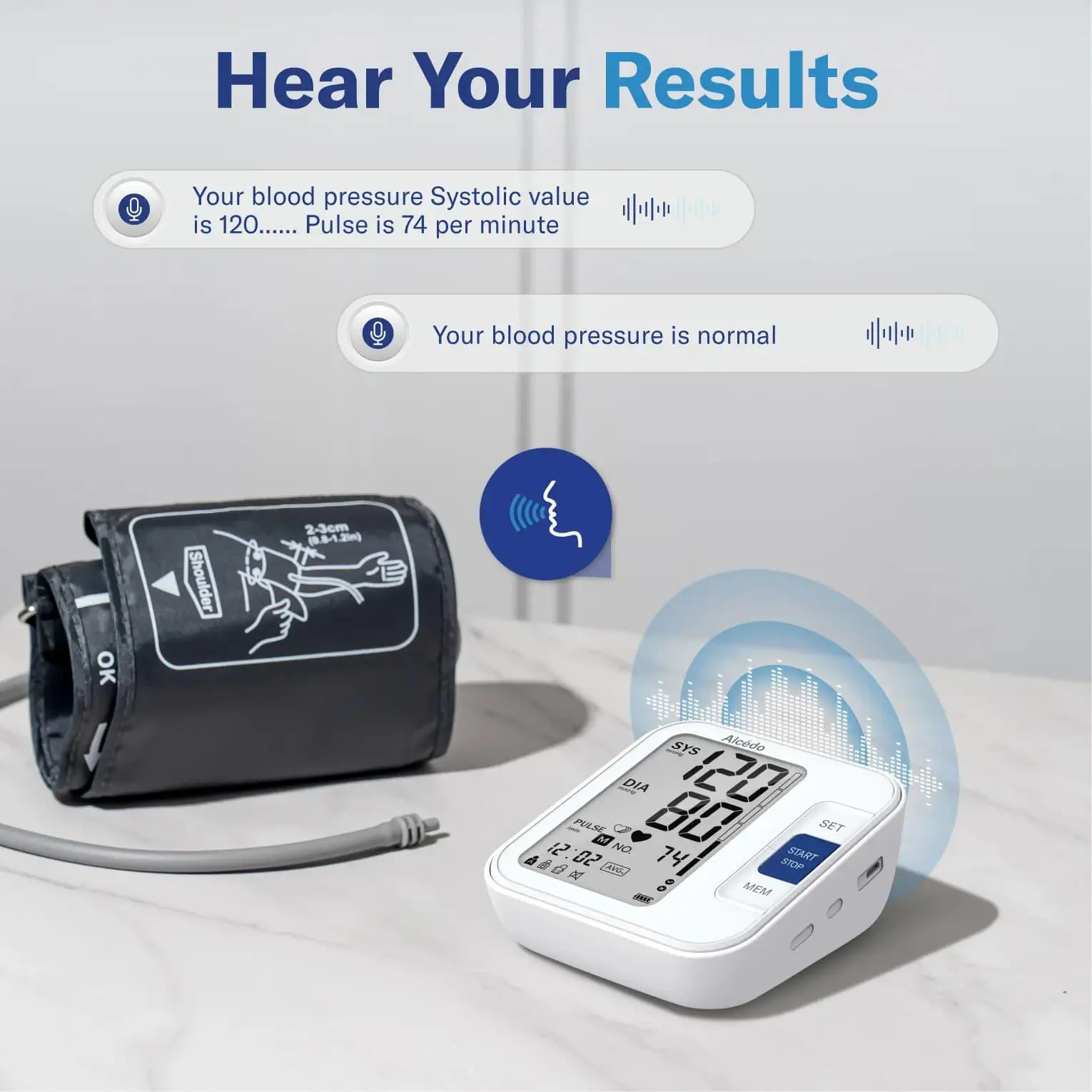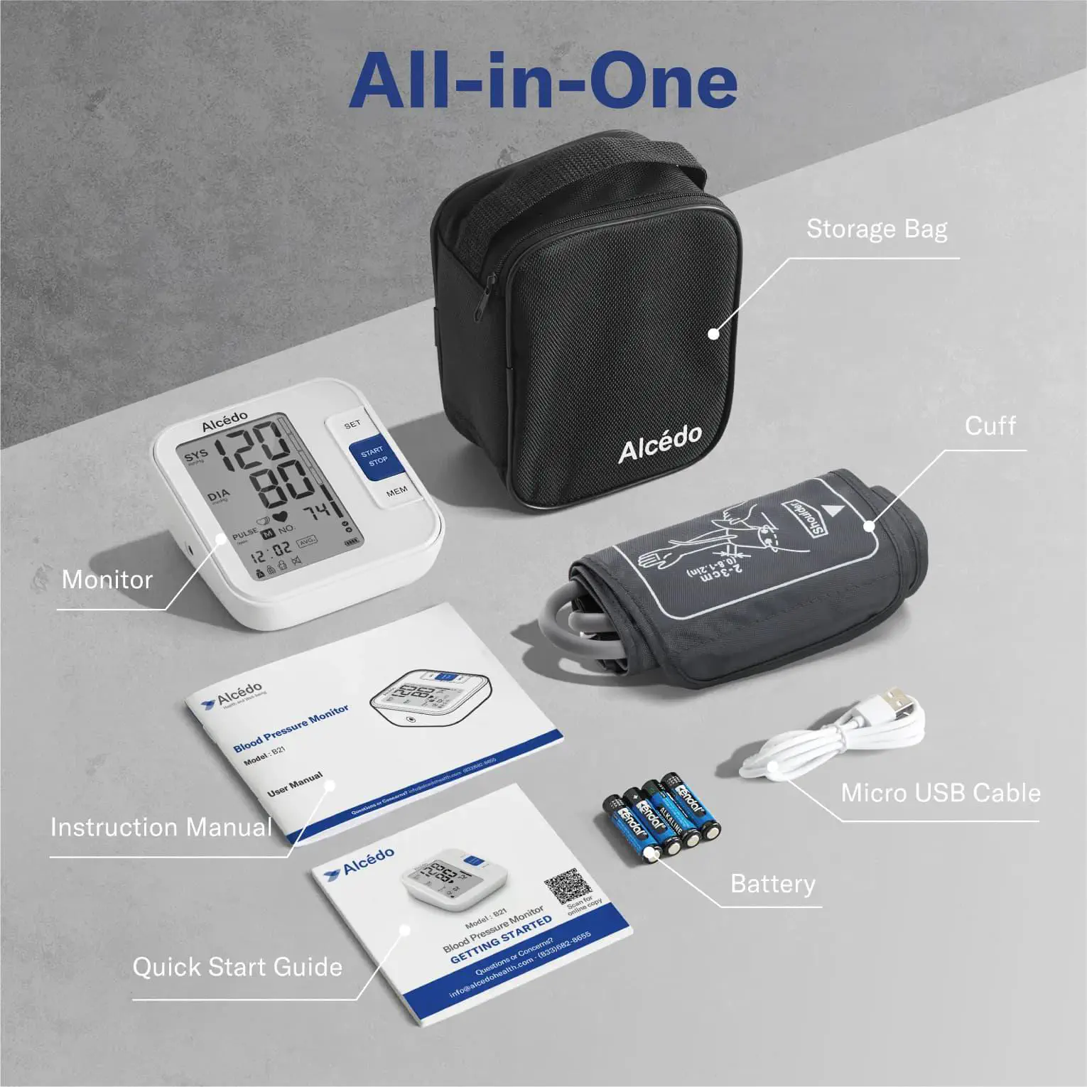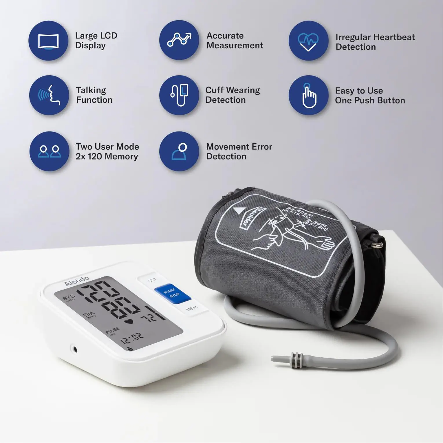 Tensiómetro digital Alcedo B21 con pantalla LCD clara, transmisión de voz y modo de dos usuarios. Incluye brazalete de amplio rango y batería.